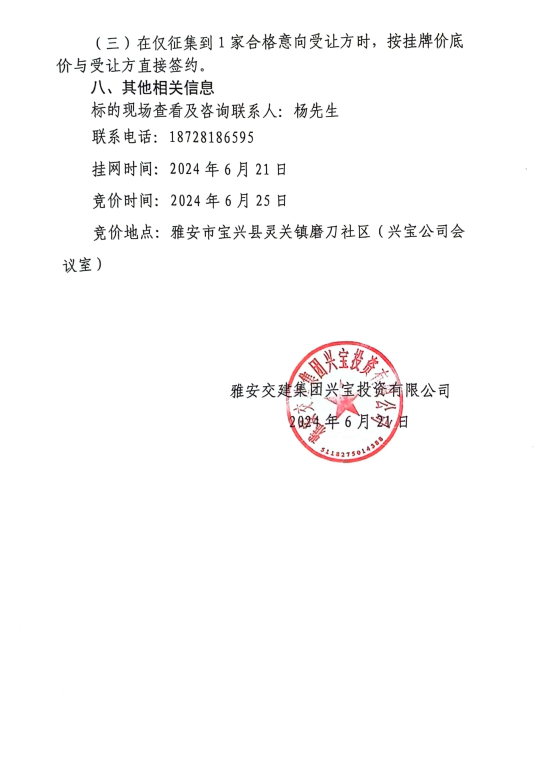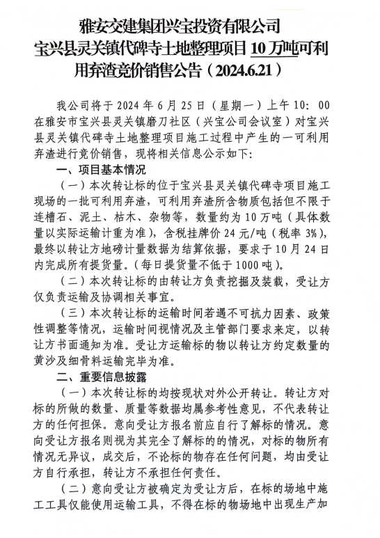 雅安交建集團(tuán)興寶投資有限公司寶興縣靈關(guān)鎮(zhèn)代碑寺土地整理項(xiàng)目10萬(wàn)噸可利用棄渣競(jìng)價(jià)銷售公告(2024.6.21)