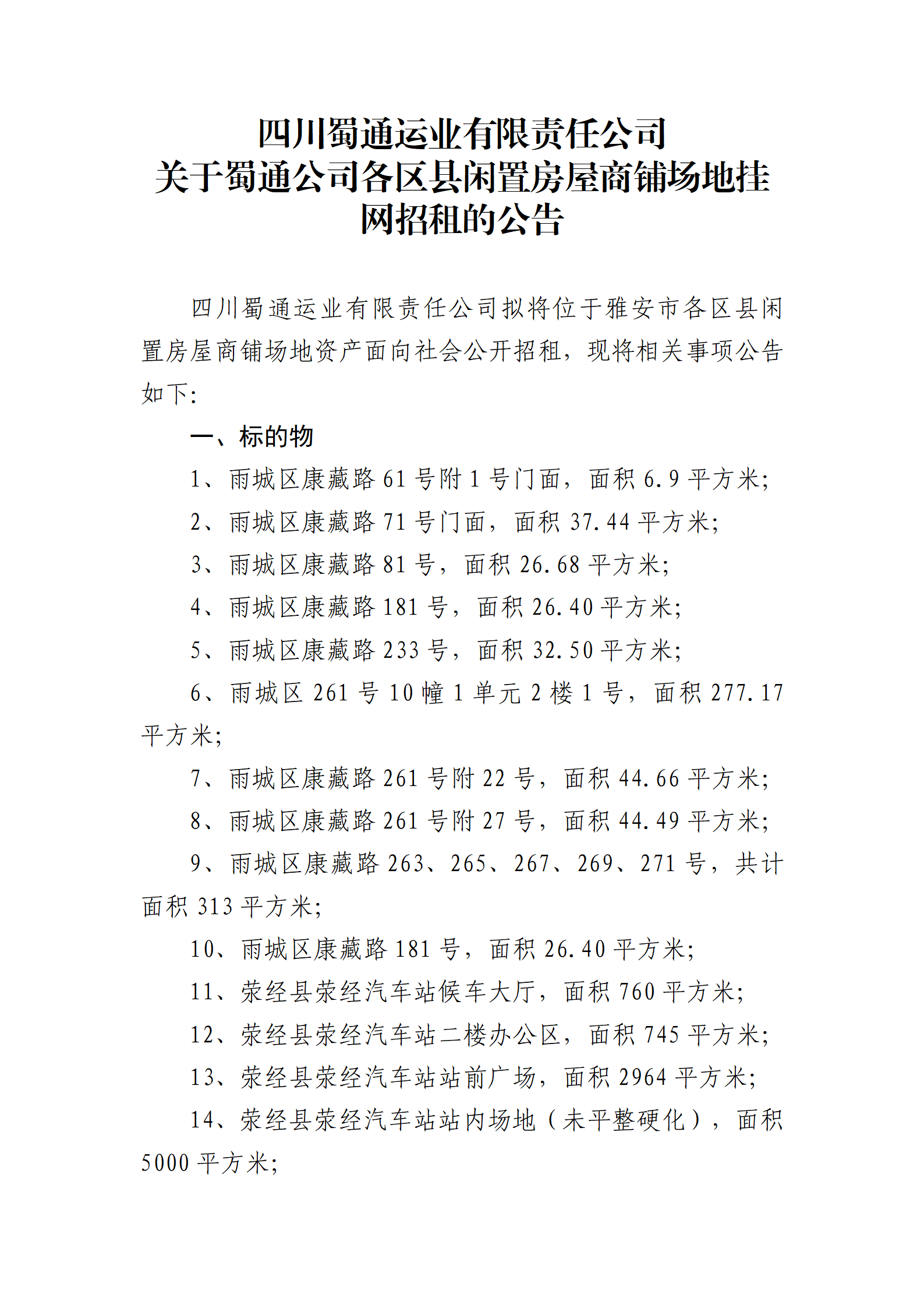 四川蜀通運(yùn)業(yè)有限責(zé)任公司關(guān)于蜀通公司各區(qū)縣閑置房屋商鋪場地掛網(wǎng)招租的公告
